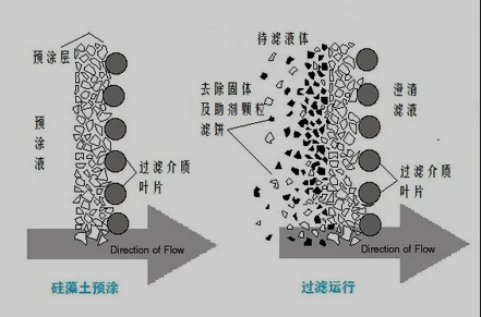 采用矽藻土助濾劑進行過濾一般分兩步操作。