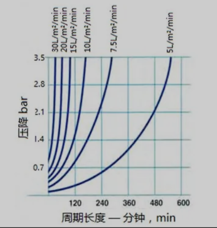 下圖顯示了過濾速率對過濾周期長度的影響。例如,5L/m²/min的過濾速率,過濾器將運行480分鍾並達到2.1bar的壓降。以兩倍的過濾速率運行,循環周期長度大約為150分鍾。一個典型壓力葉片式過濾器,當達到3.5bar壓降時,過濾周期結束。